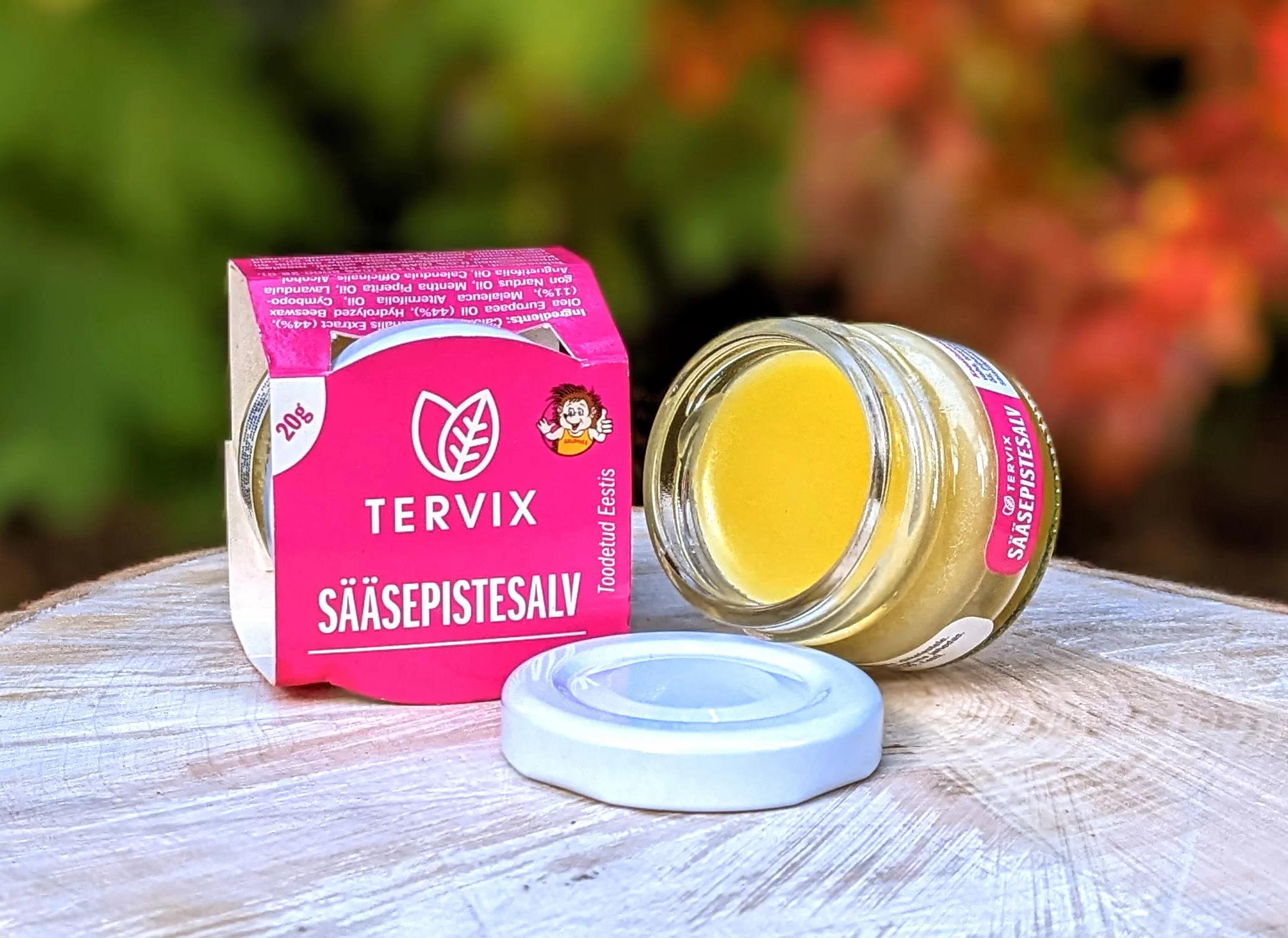 Koostisosad: Saialilleõli rapsiõli baasil, oliivõli, mesilasvaha, saialilletinktuur, teepuu eeterlik õli, tsitronella eeterlik õli, piparmündi eeterlik õli, lavendli eeterlik õli, vesi, allergeen limoneen (sisaldub looduslikult teepuuõlis). Toode ei sisalda sünteetilisi aineid.